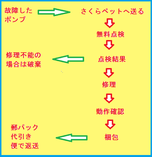 ● 点検して修理可能か調べます。修理できない時はご連絡します。修理可能なら修理して郵パック代引きでポンプをご返送いたします。